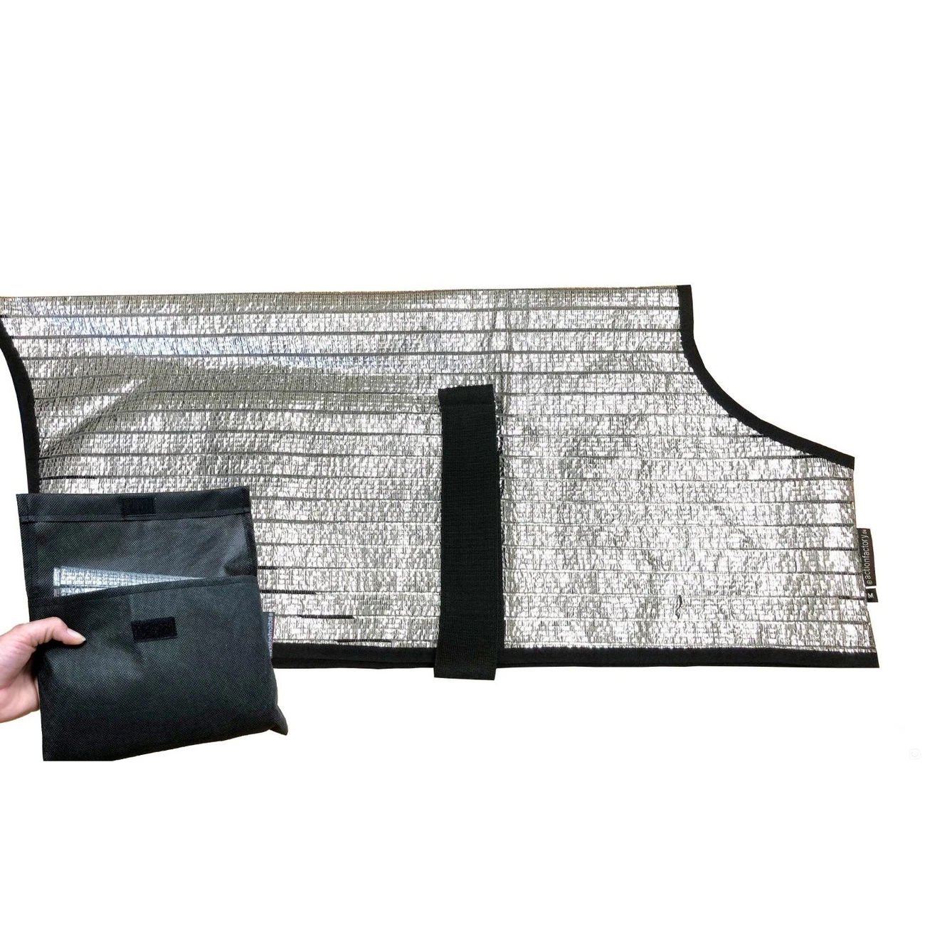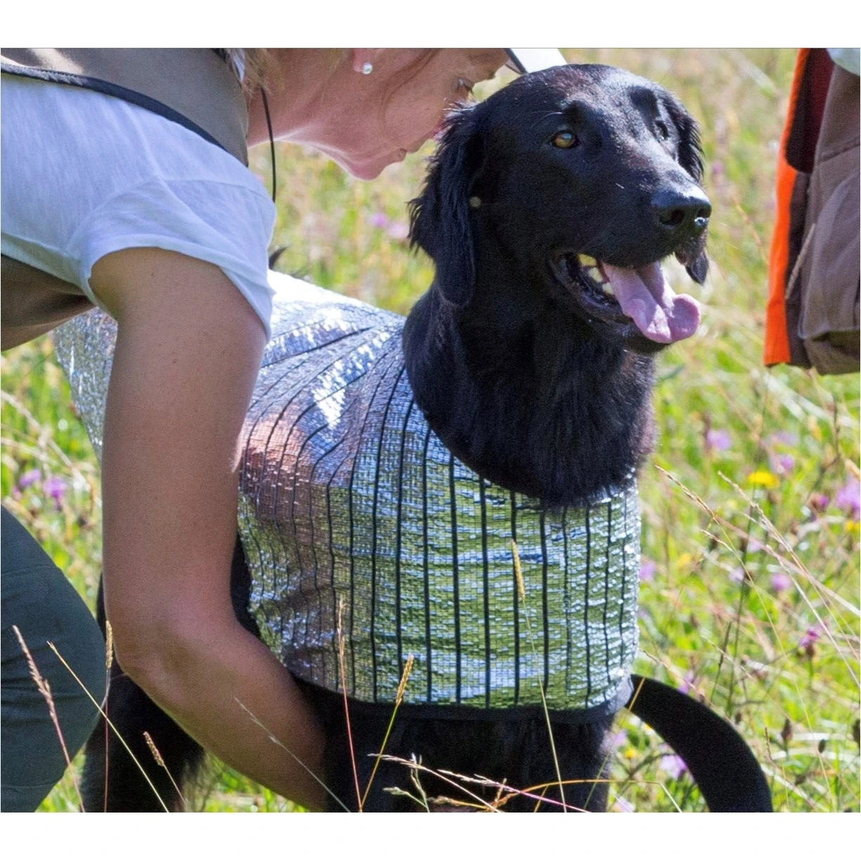 Wie ein Spiegel reflektiert die glänzende Seite 85 % der Sonneneinstrahlung und hält so die Hitze zuverlässig ab (Das Gewebe besteht aus robusten Polyesterfäden, die mit einer Aluminiumbeschichtung bedampft sind ). Ds Material ist federleicht (ca.120 Gramm Gr. L), es nimmt kein Wasser auf und behindert den Hund in keinster Weise!