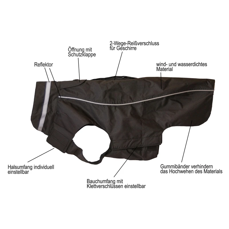 Das Abtrocknen des Hundes nach dem Spaziergang wird überflüssig und Sie vermeiden viel Schmutz im Haus. Die Funktionen des Regenmantels vereinfachen das An- und Ausziehen. Der Regenmantel passt sowohl Rüden wie auch Hündinnen.