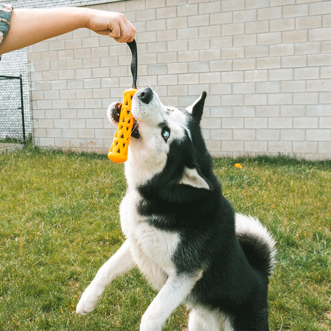 Für den kräftigen Spaß beim Zerren und Werfen sorgt die starke Schlaufe. Auch die Knisterfolie im Inneren des TPR Spielzeugs lädt zum Spielen und Freuen ein. Für eine möglichst gelungene Flugbahn steht außerdem die aerodynamische Form, die ein Merkmal der bite me Serie darstellt.