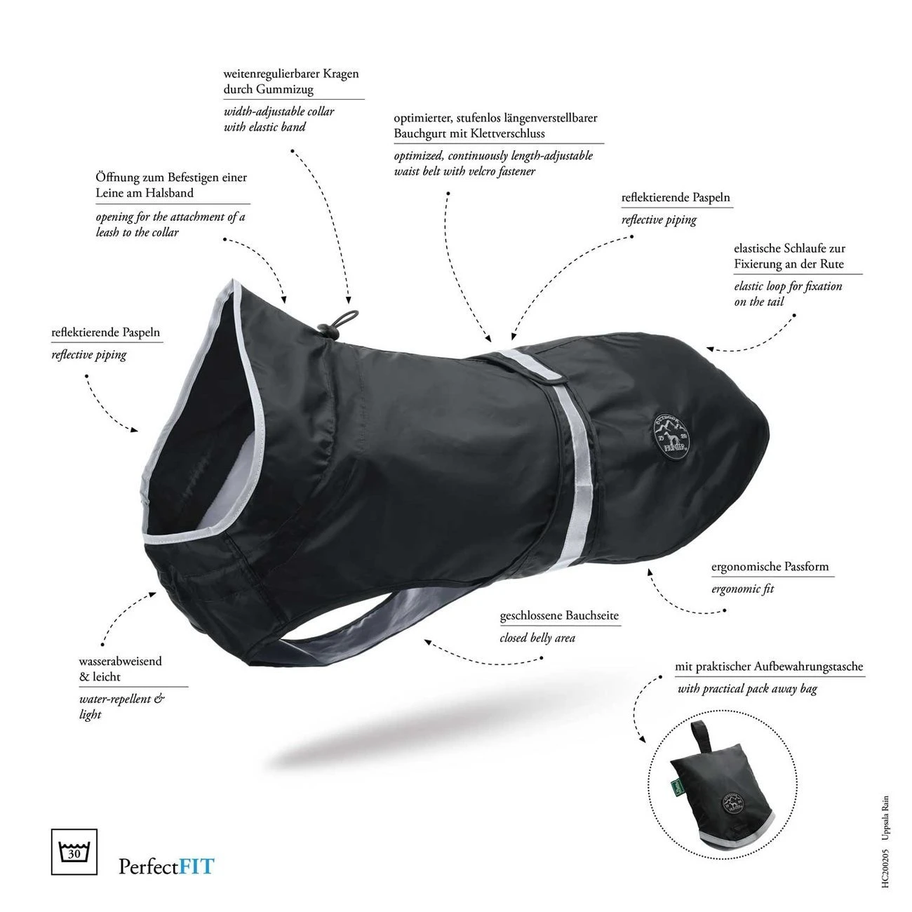 Hochwertiger Hunde Regenmantel Uppsala Rain von HUNTER. Die ultimative Kombination aus optimalem Schutz, maximalem Tragekomfort und ausgefeiltem Design. Als Ergebnis eines intensiven Entwicklungsprozesses überzeugen diese schicken Bekleidungsstücke mit ergonomischer Passform und speziellen Eigenschaften, die für fast jeden Bedarf das richtige Modell bieten. Der ebenso schlichte wie praktische Hunde-Regenmantel UPPSALA RAIN erfüllt seinen Zweck und schützt den Hund jederzeit vor Regen, Wind und Schmutz. Mittels Gummizug, kann die Kragenweite individuell reguliert werden. Ein stufenlos längenverstellbarer Bauchgurt mit Klettverschluss sowie eine elastische Schlaufe zur Fixierung an der Rute sorgen dafür, dass auch in Bewegung nichts verrutschen kann. Der Bauchgurt und der Kragen sind reflektierend, für optimale Sichtbarkeit auch bei schwierigen Sichtverhältnissen. Besonders praktisch: ist der Regenschauer vorüber, kann UPPSALA RAIN kurz abgetrocknet und platzsparend in der kleinen Aufbewahrungstasche verstaut werden. Die kleine Tasche passt in jede Hosen- oder Jackentasche und ist immer sofort zur Hand. Der Regenmantel ist bei 30 °C in der Maschine waschbar.