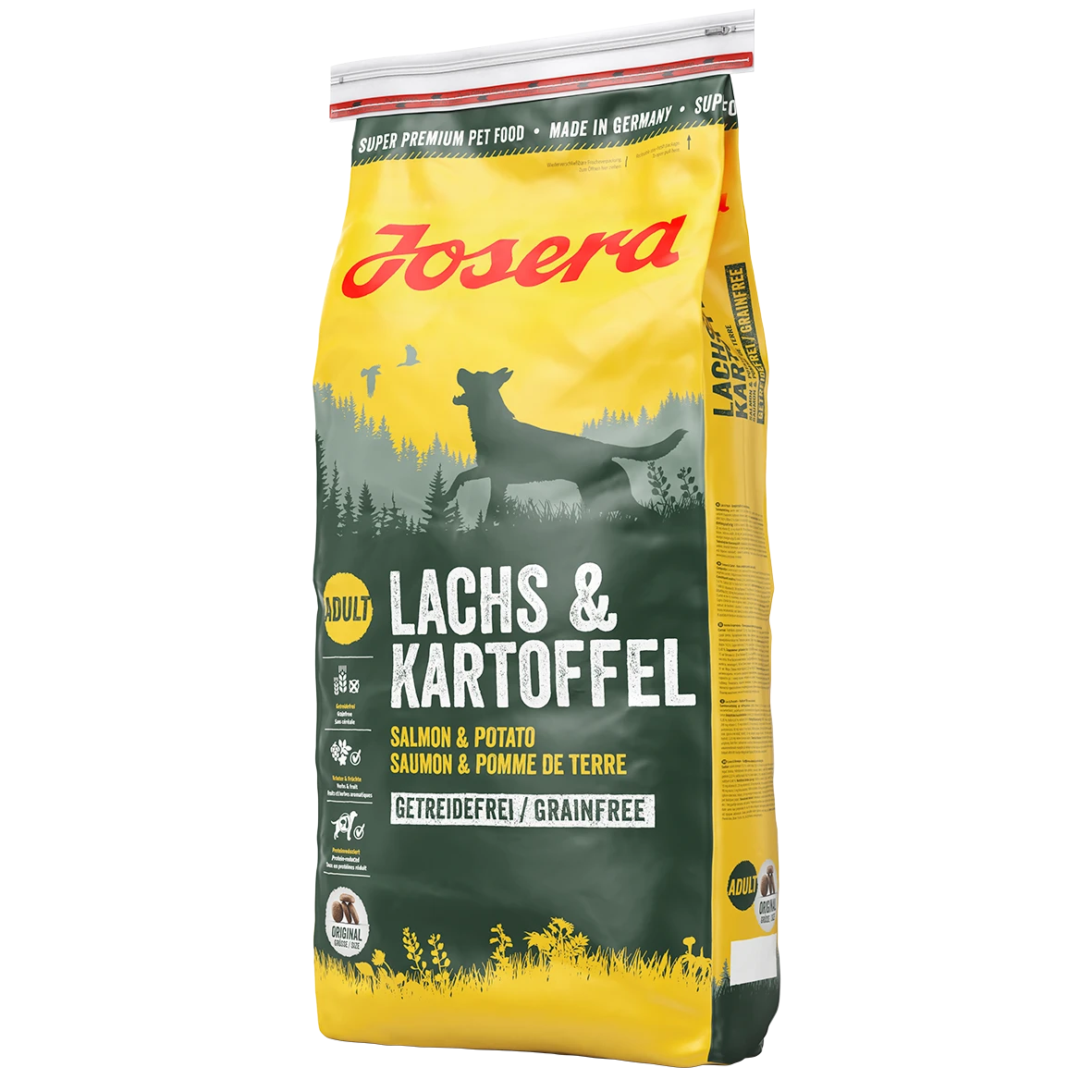 JOSERA Lachs & Kartoffel ist eine bekömmliche Rezeptur ohne Getreide und besonders geeignet für empfindliche Hunde.