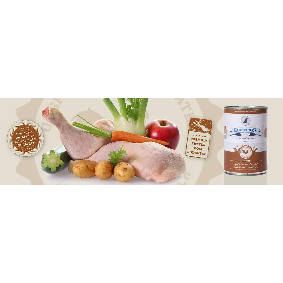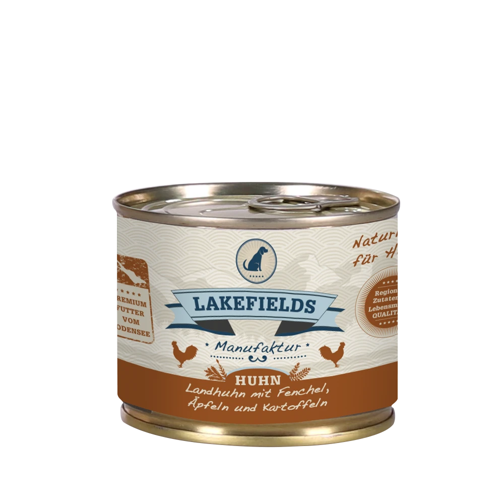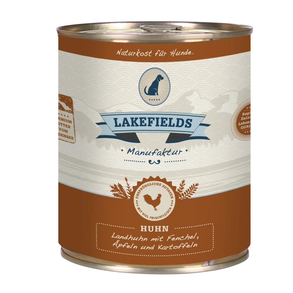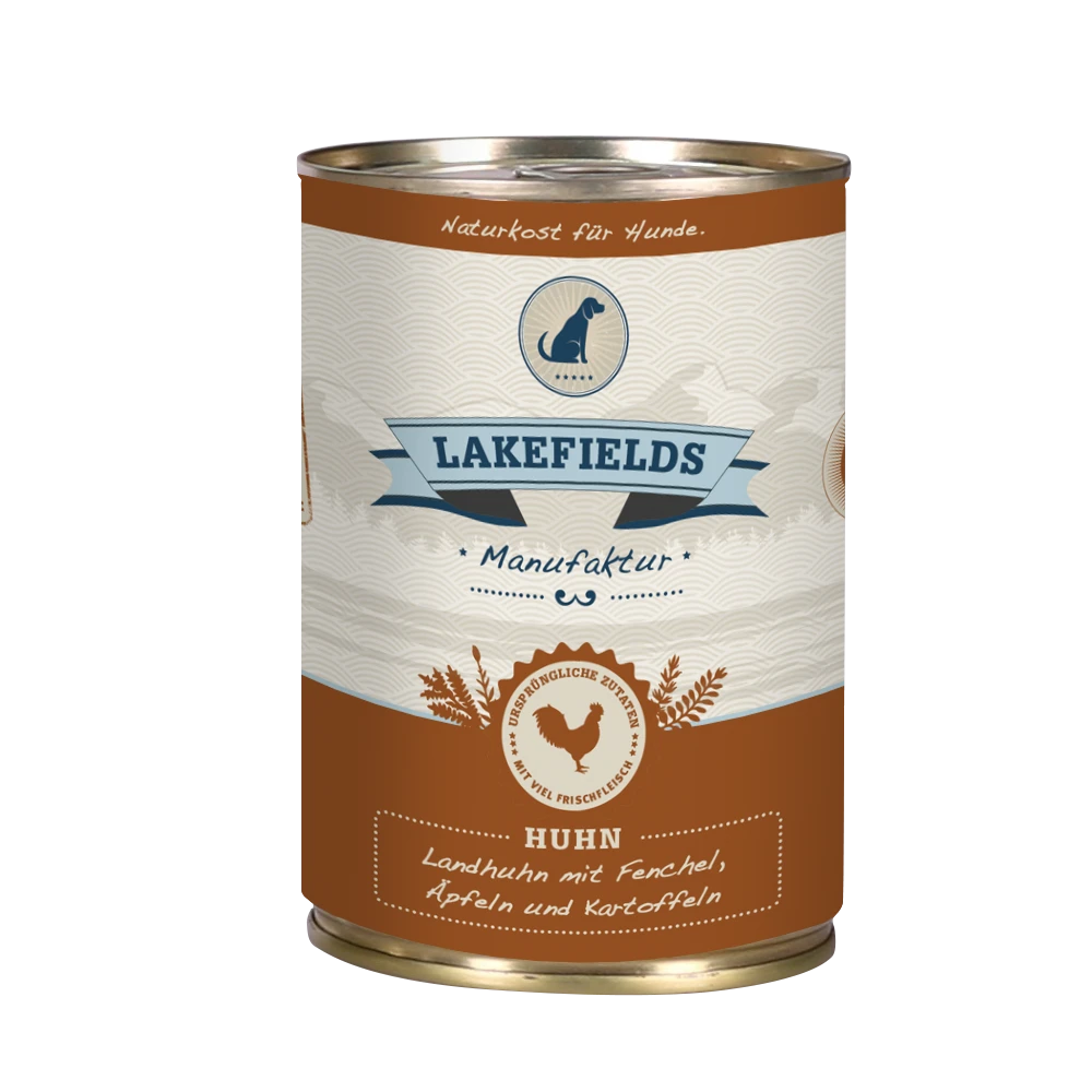 Lakefields Dosenfleisch-Menü Huhn ist ein Alleinfuttermittel für Hunde.