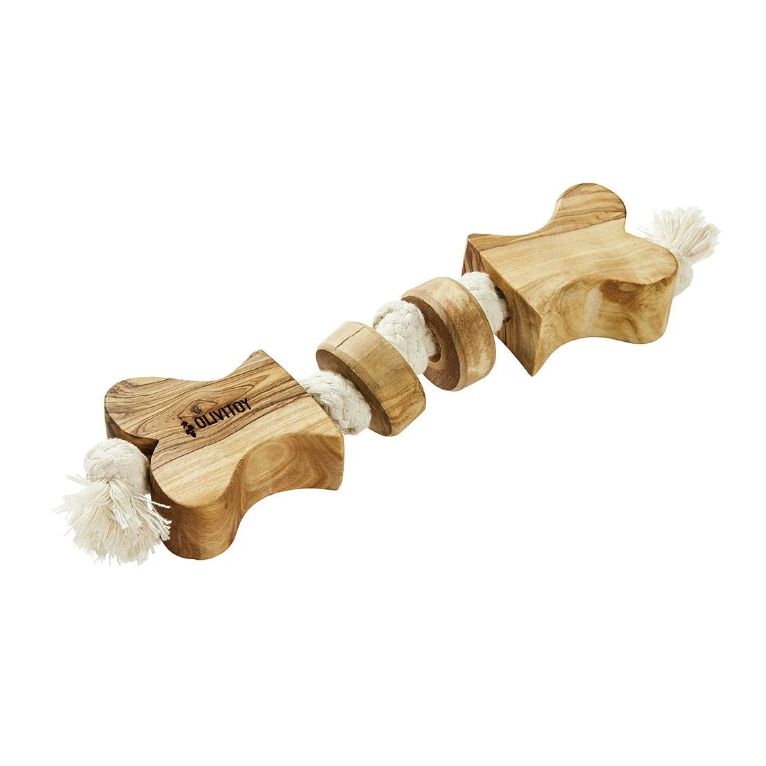 Das Olivi Knochen Tau-Spielzeug ist aus feinstem, naturbelassenem Olivenholz aus nachhaltigem Anbau und einem hochwertigen Baumwoll-Tau gefertigt. Die Holzelemente wurden zusätzlich mit reinem Olivenöl in Handarbeit liebevoll veredelt. Dieses Produkt stellt ein besonders natürliches und nachhaltiges Kauspielzeug für Hunde dar. Das integrierte Baumwoll-Tau ist nach dem OEKO-TEX® Standard 100 zertifiziert. Somit gilt der Olivi Tau-Spielzeug Knochen als gesundheitlich völlig unbedenklich, da alle Bestandteile des Produktes auf Schadstoffe überprüft worden sind. Das Olivenbaumspielzeug ist völlig frei von jeglichen Gift- und Gefahrstoffen sowie von chemischen Weichmachern.