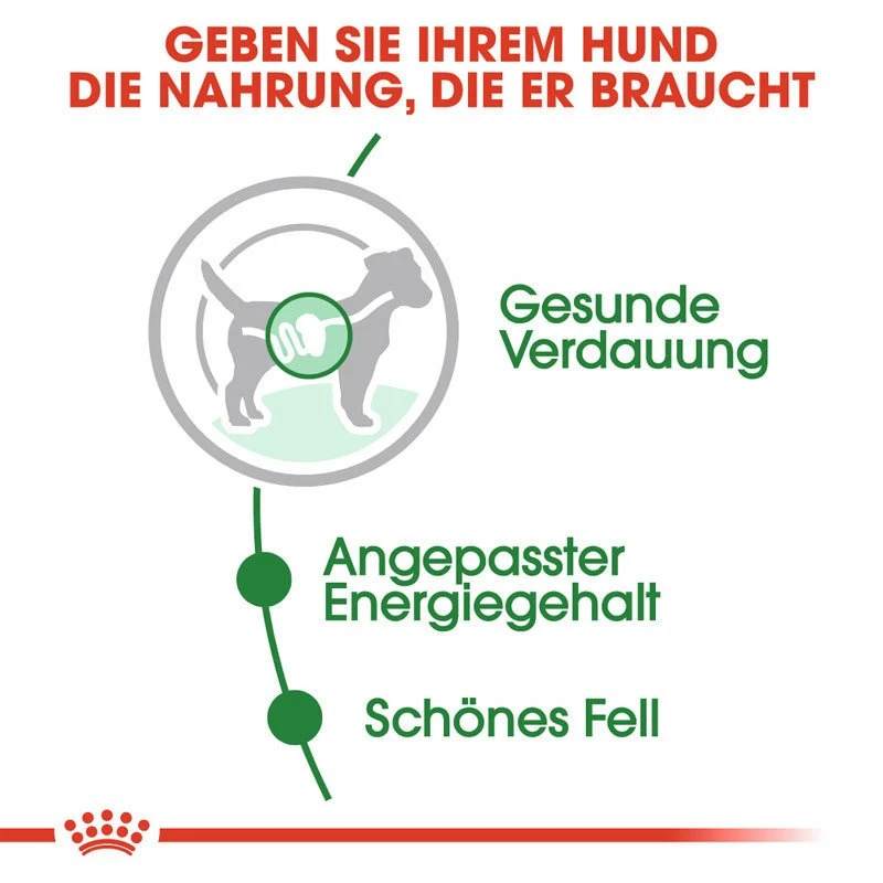 Die Rezeptur von ROYAL CANIN Mini Adult in Soße unterstützt mit speziellen Nährstoffen die Gesundheit des Hundes und trägt zu einer ausgeglichenen Darmflora bei. Auch das Vermeiden einer übermäßigen Gewichtszunahme ist in den Erwachsenenjahren des Hundes wichtig, da der Stoffwechsel langsamer verläuft als bei Welpen. Der sorgfältig angepasste Energiegehalt von ROYAL CANIN Mini Adult in Soße hilft, das Idealgewicht kleiner Hunde zu erhalten.