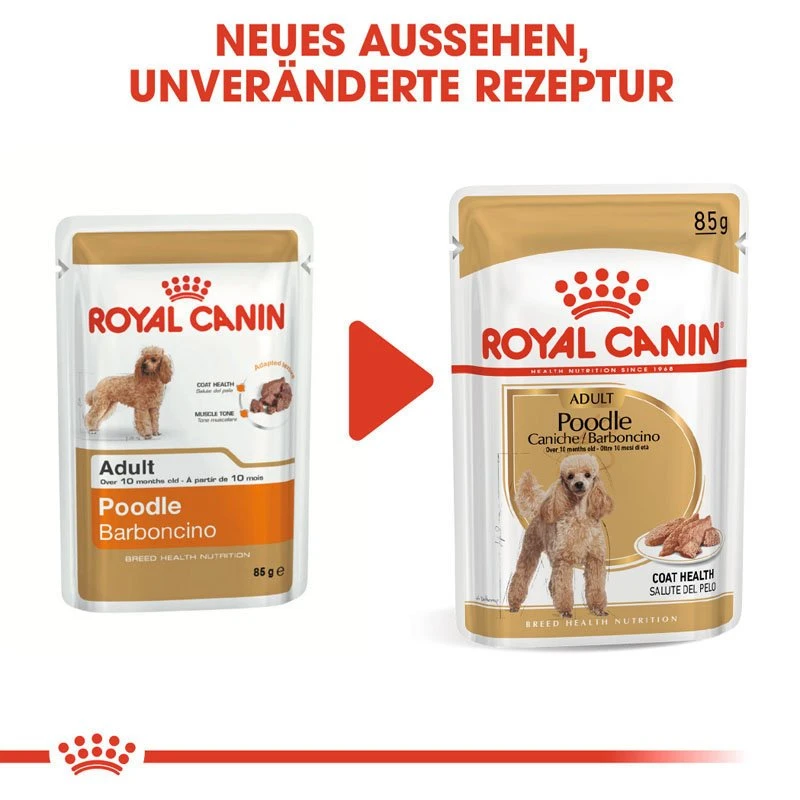 Royal Canin Poodle Adult in Soße Hundefutter nass für Pudel ist ein Alleinfuttermittel für Hunde.