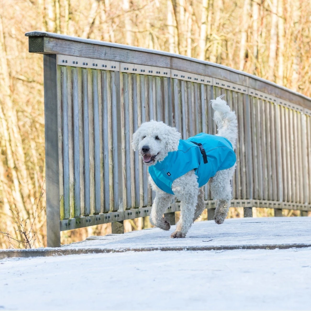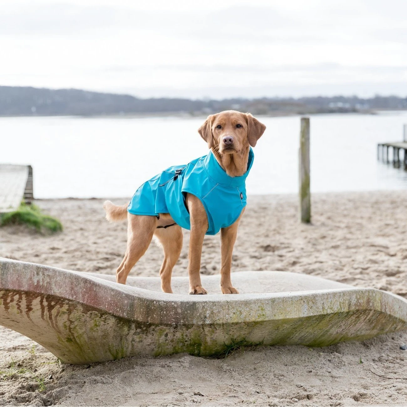 - mit zwei wasserdichten Reißverschlüssen: im Halsbereich zum Anleinen an ein Halsband, im Rückenbereich mit einem Geschirr kombinierbar