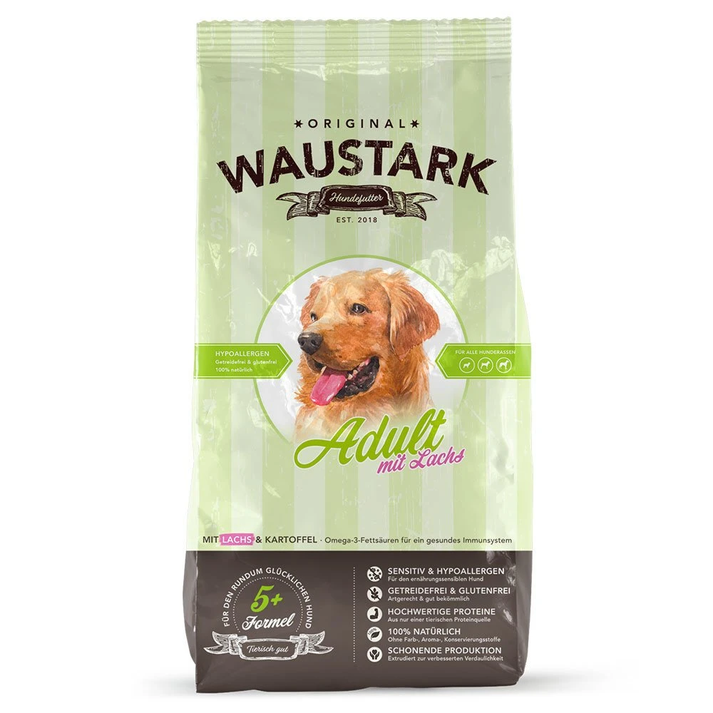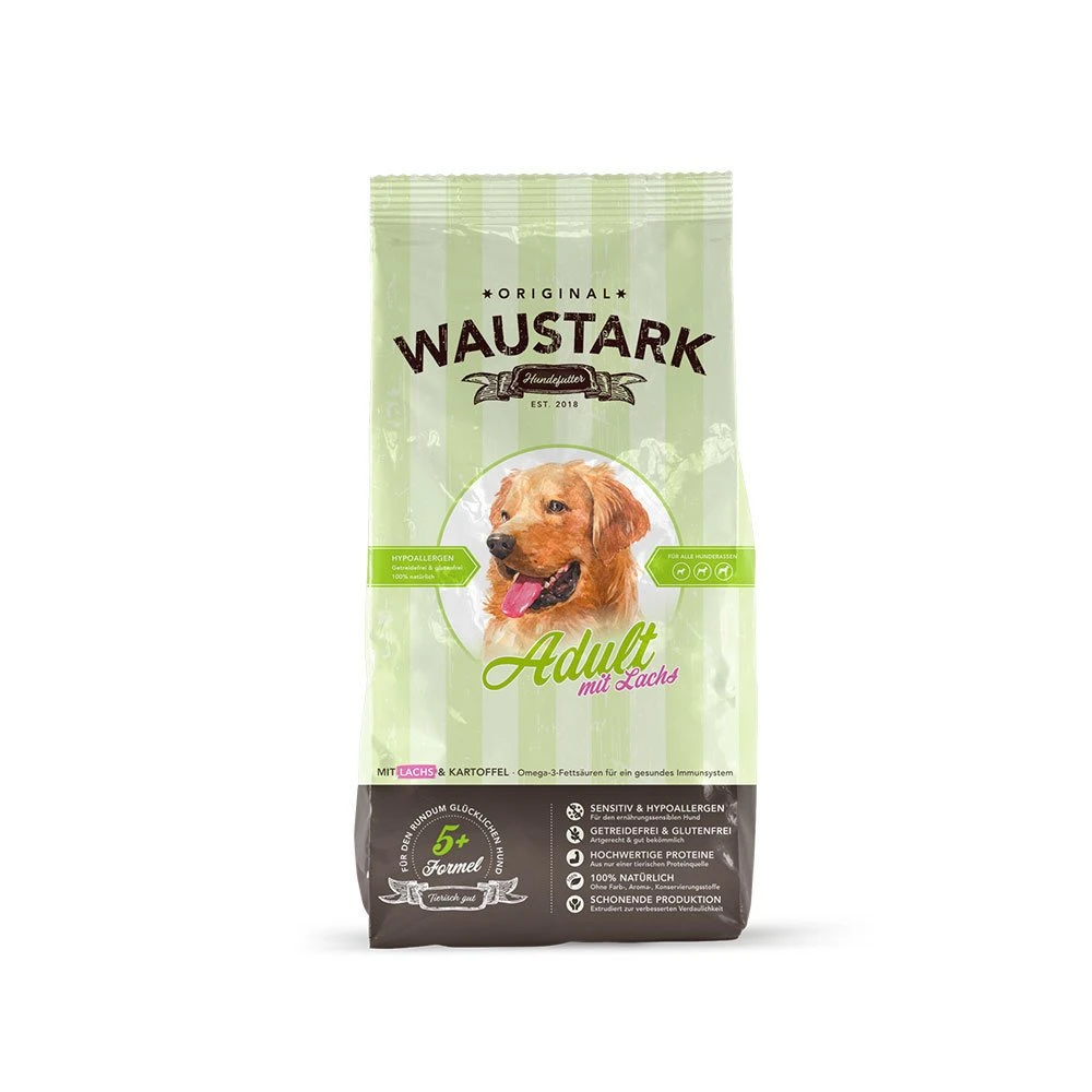 Waustark Hundefutter mit Lachs ist ein Alleinfuttermittel für Hunde.