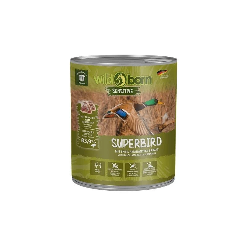 Das Wildborn Superbird Hundefutter mit frischem Entenfleisch, Amaranth und Spinat. Das Super Premium Nassfutter ist für alle Hunde jeder Rasse ab dem 1. Lebensjahr geeignet.